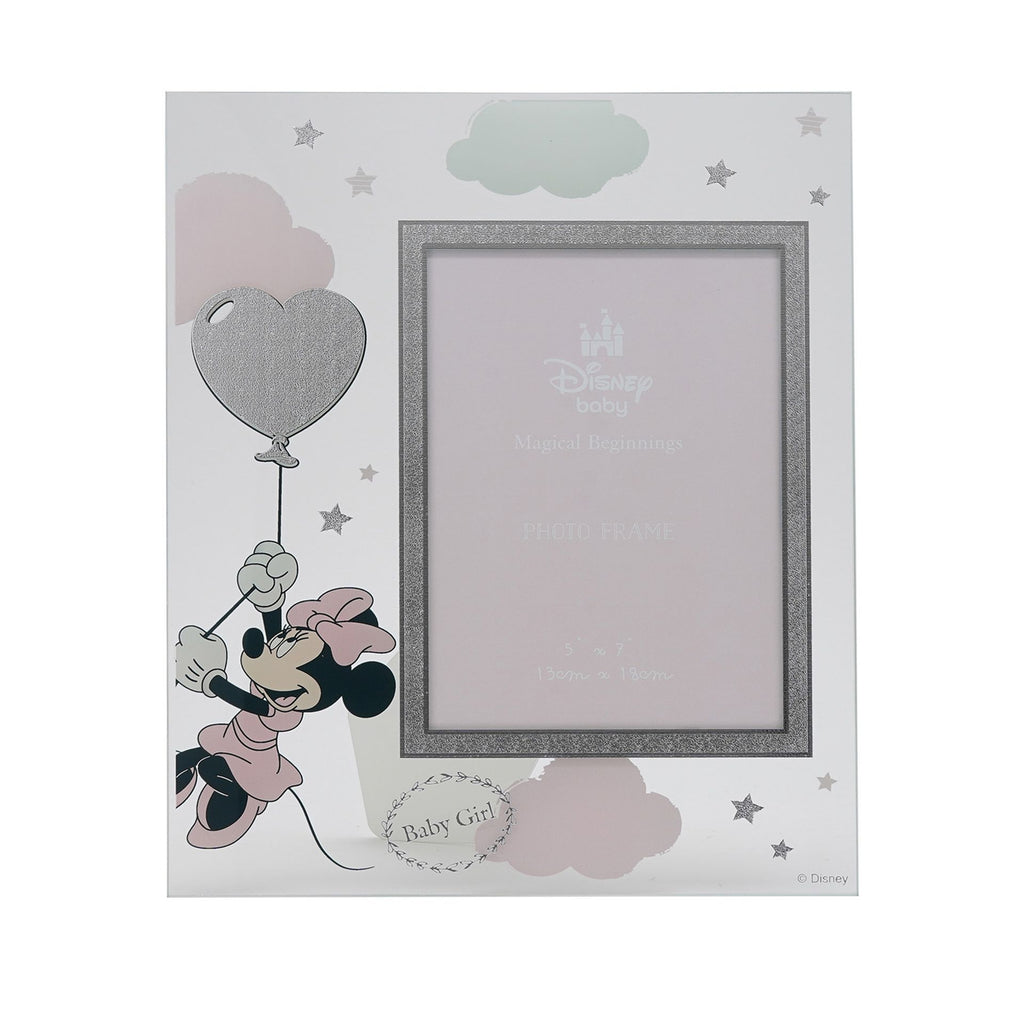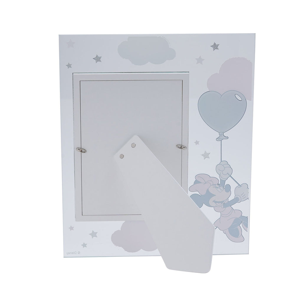 Bring a touch of Disney magic to your home with this delightful Minnie Mouse photo frame, featuring real silver 999 plating for a truly special finish. The 5" x 7" glass frame showcases an adorable cartoon of Minnie holding a heart-shaped balloon, set against a dreamy background of clouds and stars.