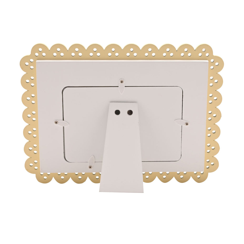 This charming wooden picture frame, featuring a delicate, lace-like border, is in a delightful shade of yellow.