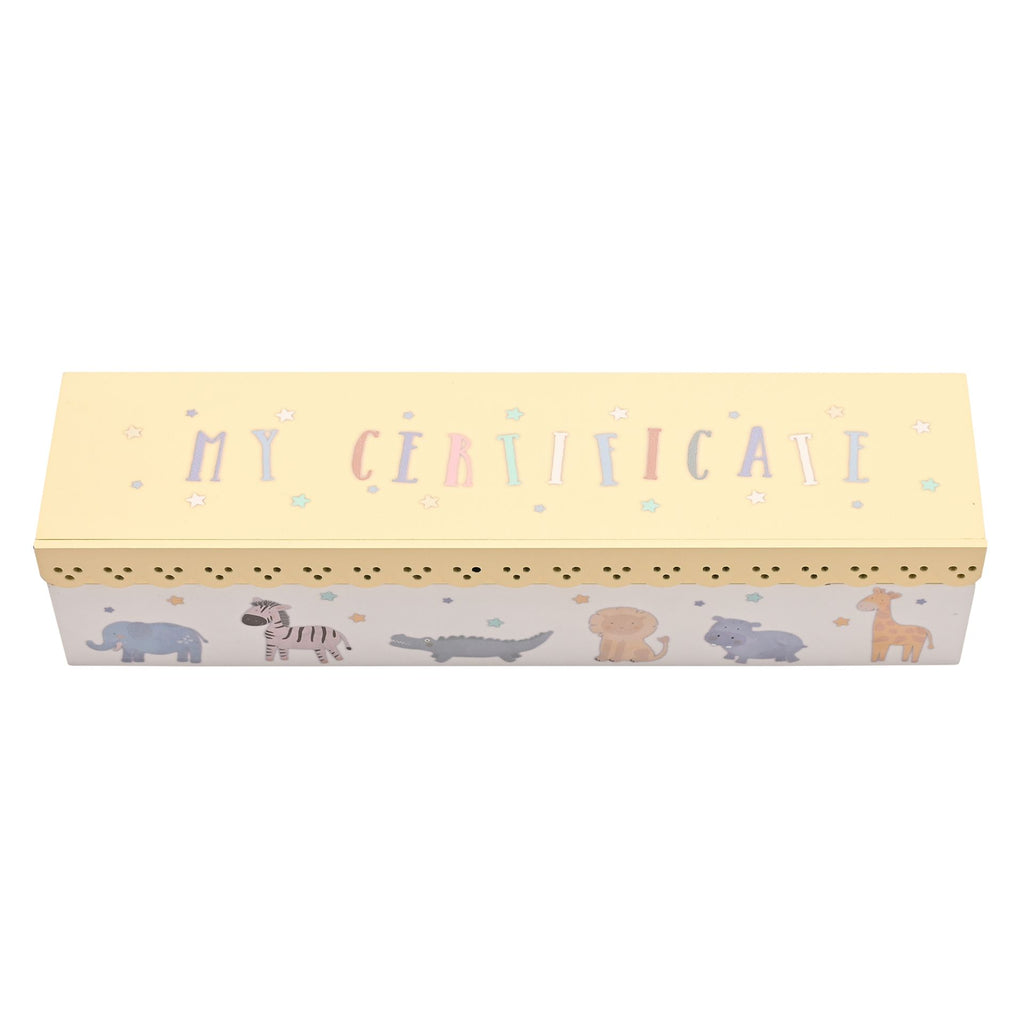 Treasure important milestones with the Petit Cheri Scallop Animal Certificate Holder. Adorned with a vibrant animal-themed design, this wooden box adds a playful touch to any space while safeguarding your precious certificates.