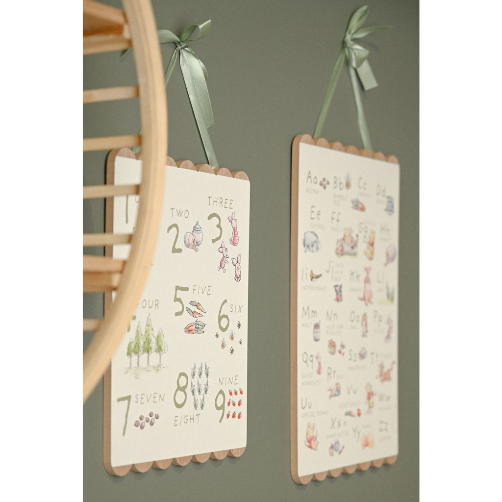 Featuring delightful illustrations of Pooh Bear and friends alongside numbers, this wooden plaque is a playful and educational décor piece for any nursery or child's room.
