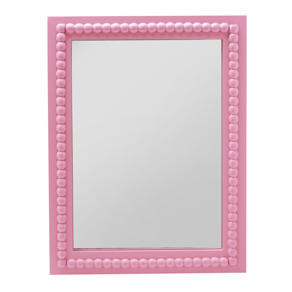 This playful mirror radiates fun with its vibrant pink frame and beaded border, making it a lively addition to any room. With picture hanging hook for wall display.