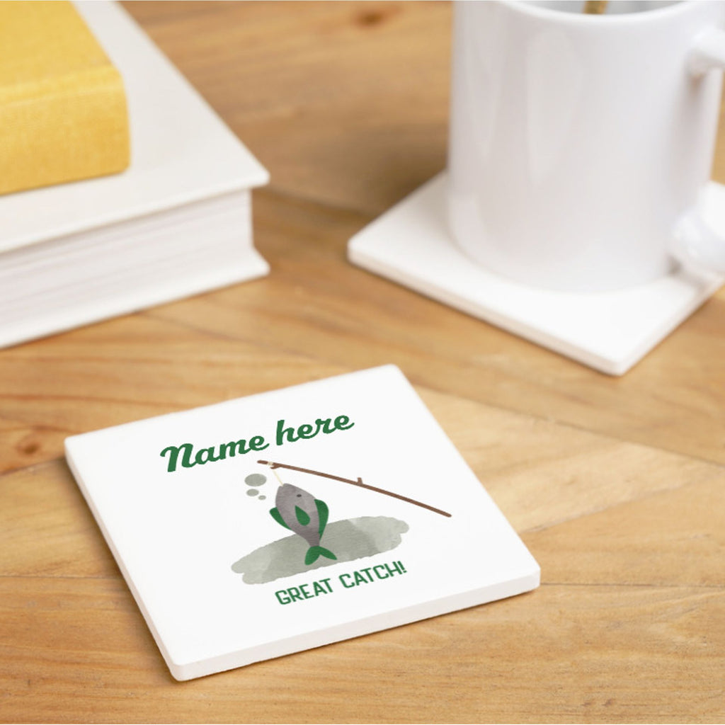 This watercolour-style coaster features the playful phrase “Great Catch” along with a beautifully illustrated fishing scene. Whether it's for dad, grandad or a fishing buddy, this personalised coaster adds charm to every coffee break or lakeside brew.
