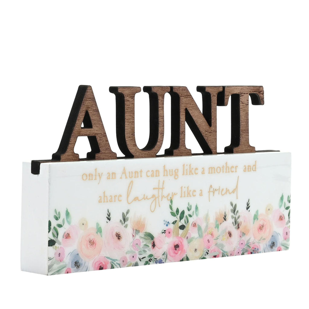 Pretty ‘Aunt’ mantel plaque with high shine finish base and title in 3D wooden lettering making a standout addition to the home. With its beautiful gold wording 'Only an Aunt can hug like a mother and share laughter like a friend’ and delicate floral design, this is the ideal reminder to them of how important they are.