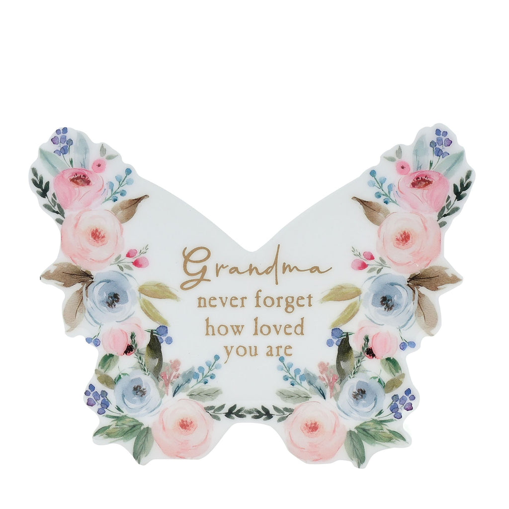 Butterfly shaped ‘Grandma’ mantel plaque with high shine finish making a standout addition to the home. With its beautiful gold wording ‘Grandma never forget how loved you are’ and delicate floral design, this pretty keepsake is the loveliest daily reminder of how loved they are.