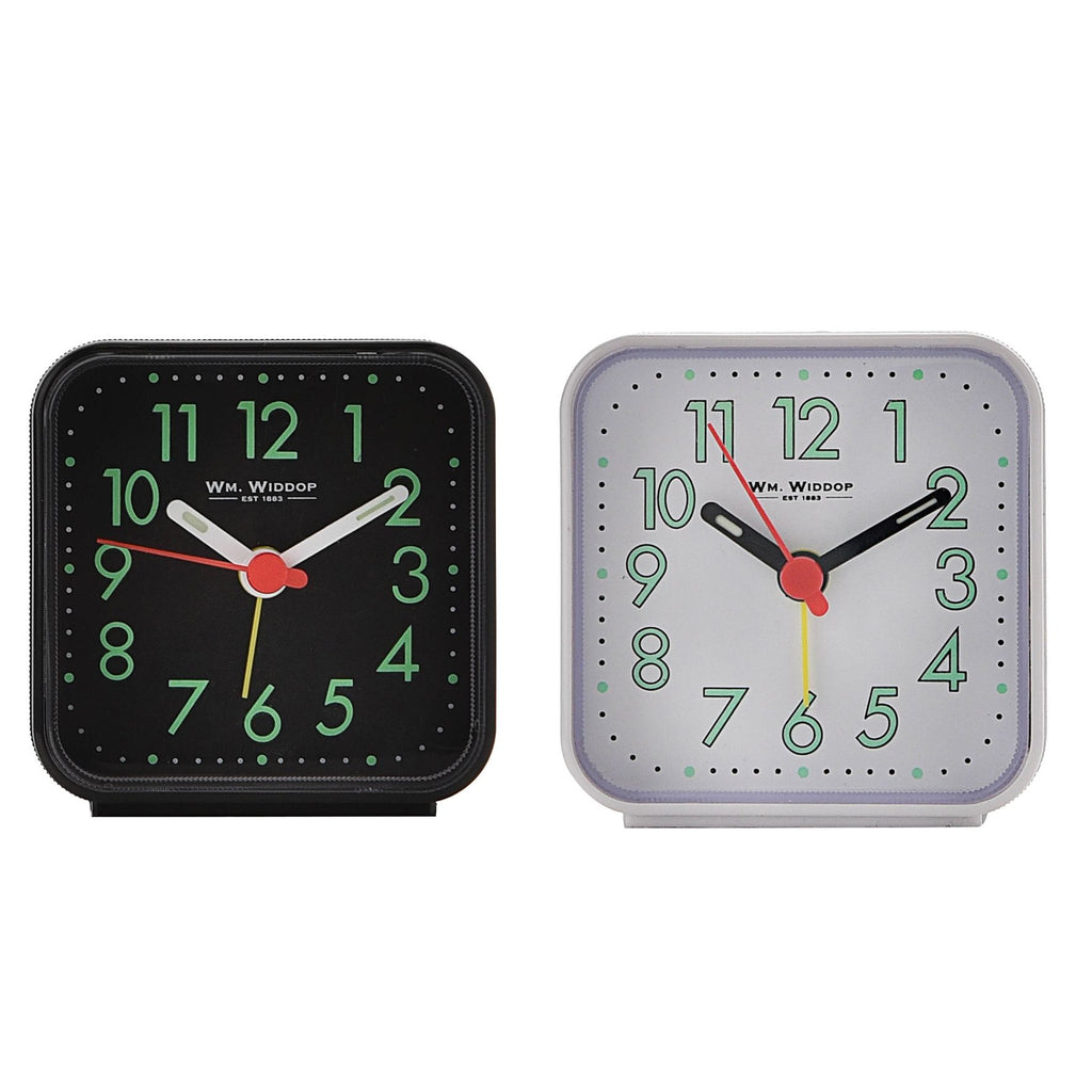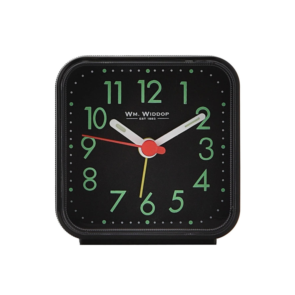 A black, square alarm clock from WILLIAM WIDDOP®.