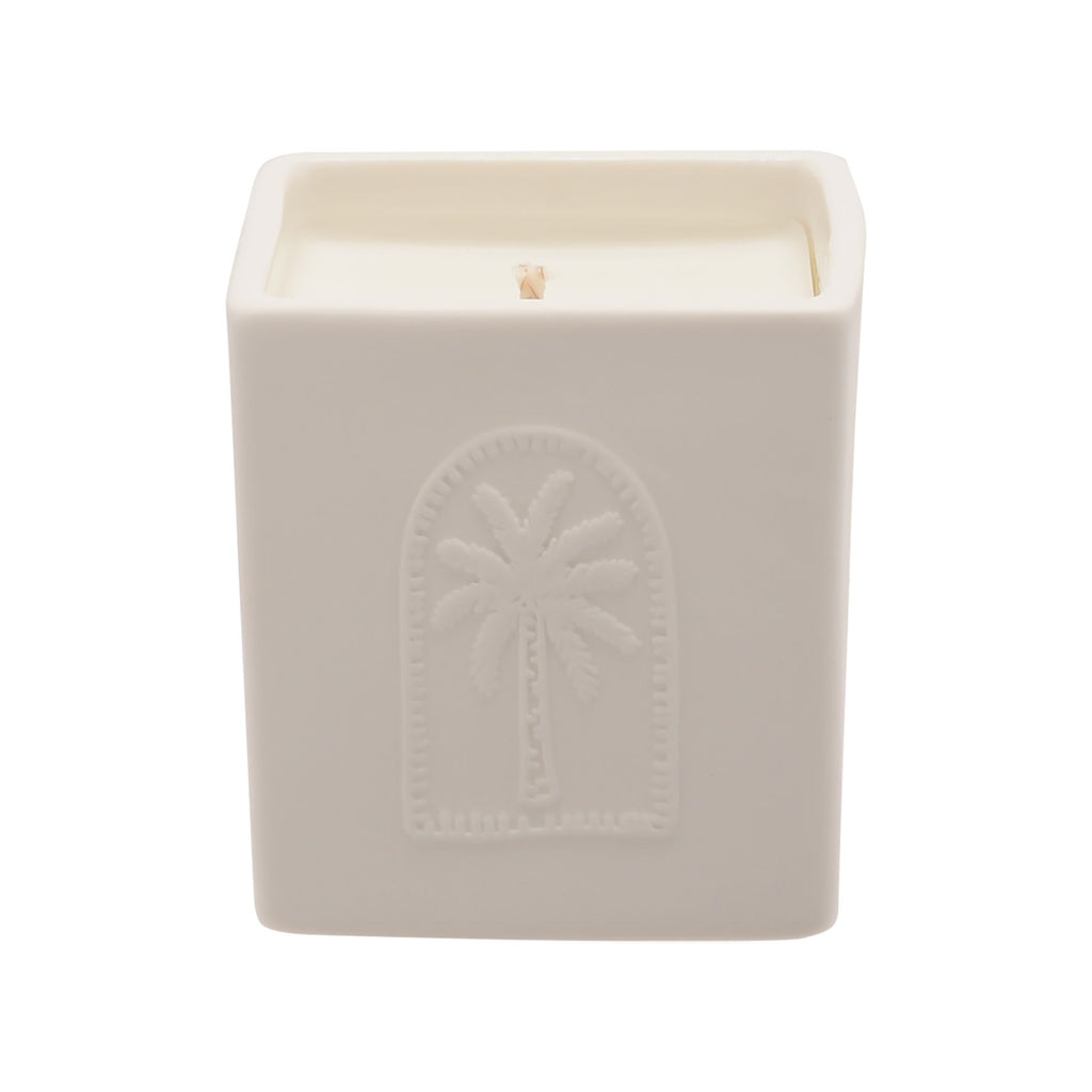 The white, square ceramic candle holder showcases an embossed palm tree design, complete with gloss finish. Inside sits a scented soy wax candle which emits an attractive aroma of driftwood musk and crystalline sea salt.