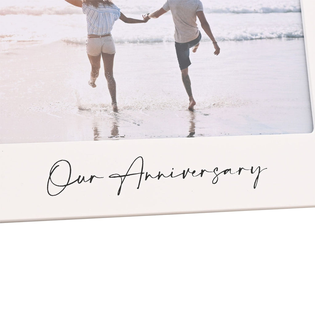 The frame features the words "Our Anniversary" and is designed to hold a 6" x 4" photo. A simple and elegant way to mark a meaningful milestone - ideal for couples celebrating an anniversary. With strut for freestanding display or hooks for wall hanging.