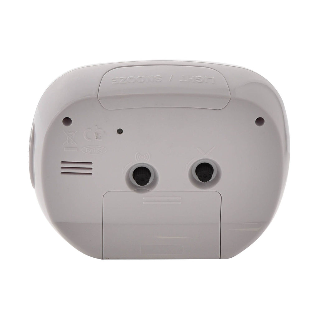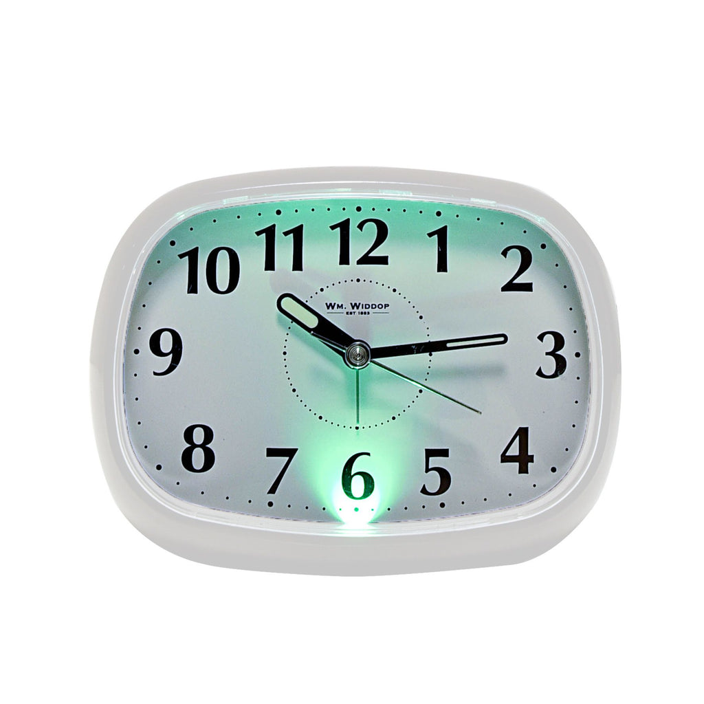 A white, oval shaped alarm clock from WILLIAM WIDDOP®.