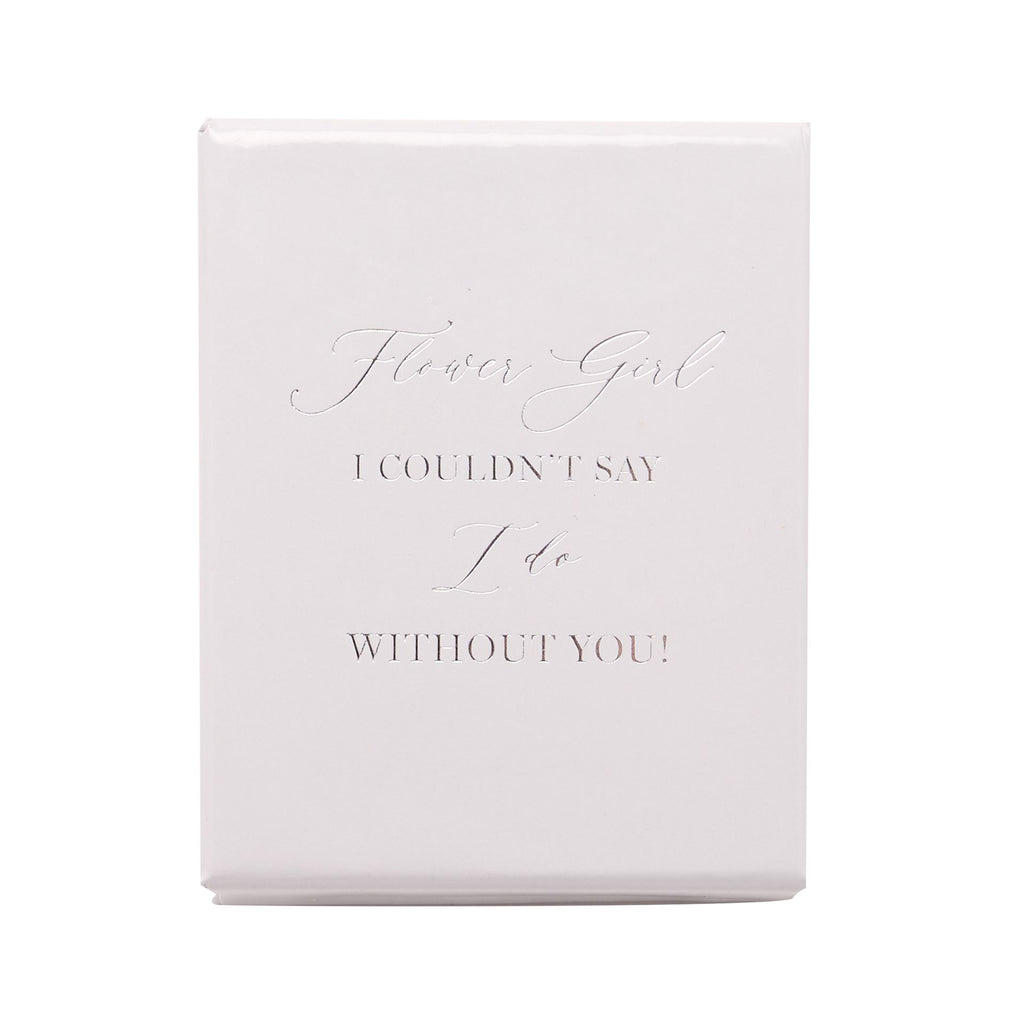 The silver metal keyring showcases a smooth finish heart with ‘Beautiful Flower Girl’ engraving. It is finished by two further heart charms.