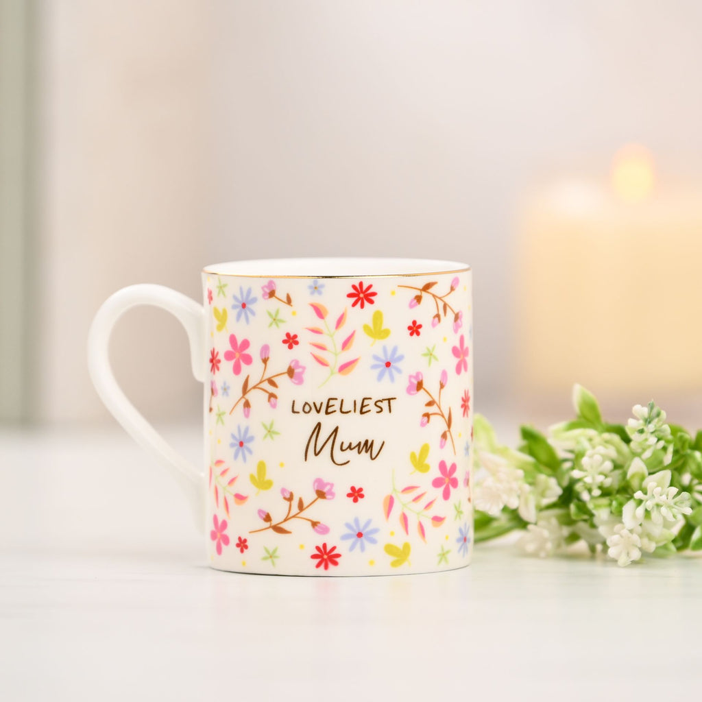 Show your mum just how much she means to you with this charming 8oz white bone china mug. Featuring a stunning all-over floral print and the message, "Loveliest" this mug is the perfect way to express your heartfelt appreciation.